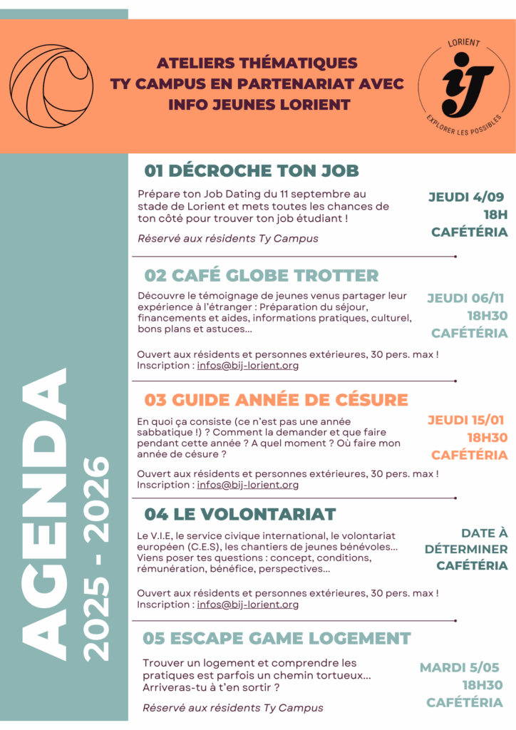 Ty Campus est fier de s’associer à Info Jeunes Lorient pour faciliter la vie étudiante à Lorient. Nous vous encourageons vivement à profiter de leurs services pour réussir tes études, construire ton avenir et t’épanouir pleinement dans ta nouvelle vie.